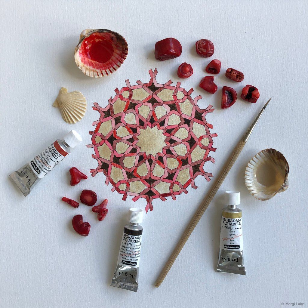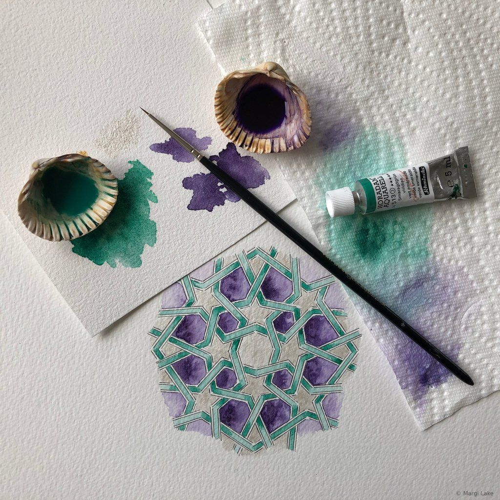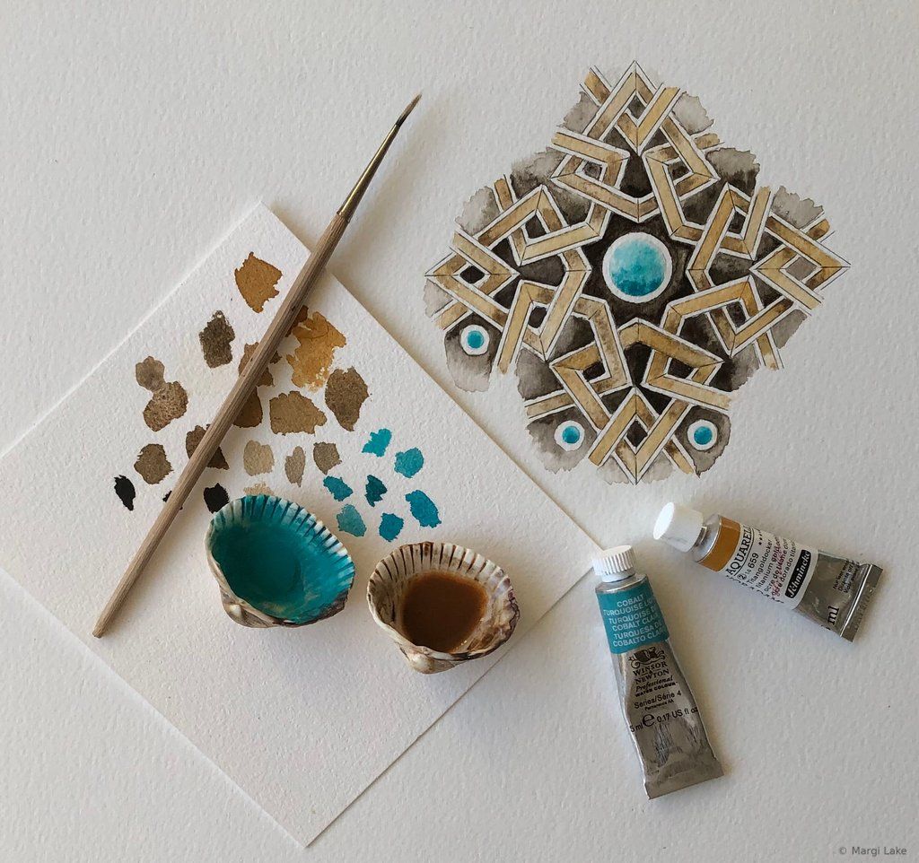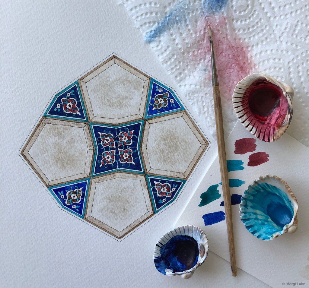 As a watercolourist, exploring colour combinations and creating vibrant, luminous palettes is part of the process of crafting an essence-rich artwork. The spirit of playfulness is paramount. Most of my palettes are inspired by the world around me, the wondrous variety of colours found in nature, the art and architecture seen during my travels to Islamic lands, but also beautiful objects seen in museums and exhibitions, films and paintings. Colours have personalities that adapt to their surroundings, so colour choices must remain fluid until the final brushstroke. In moments of heightened awareness, palettes arise spontaneously. Experimenting beforehand with different tones, hues and techniques on a small part of the pattern is a fun way to try out new ideas that may or may not inform final palette choices.