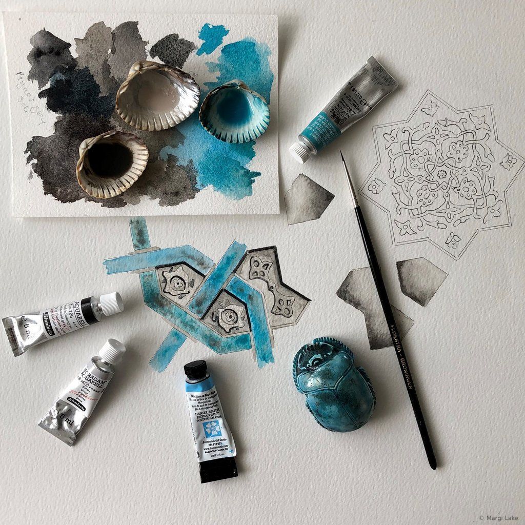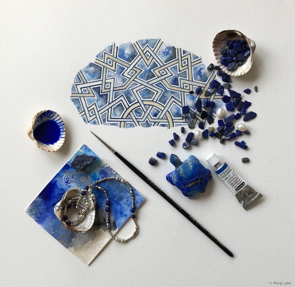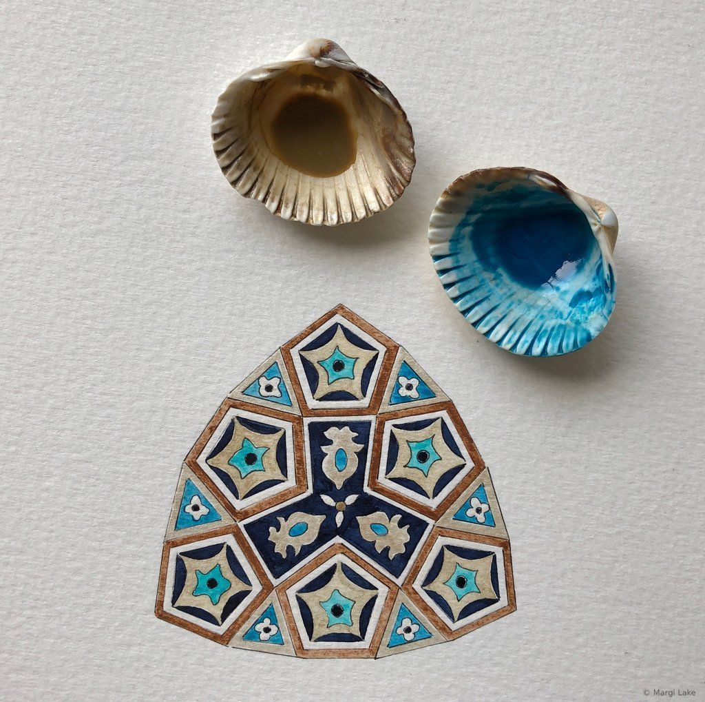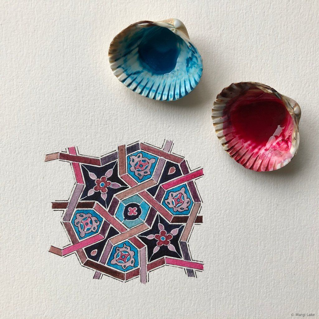 As a watercolourist, exploring colour combinations and creating vibrant, luminous palettes is part of the process of crafting an essence-rich artwork. The spirit of playfulness is paramount. Most of my palettes are inspired by the world around me, the wondrous variety of colours found in nature, the art and architecture seen during my travels to Islamic lands, but also beautiful objects seen in museums and exhibitions, films and paintings. Colours have personalities that adapt to their surroundings, so colour choices must remain fluid until the final brushstroke. In moments of heightened awareness, palettes arise spontaneously. Experimenting beforehand with different tones, hues and techniques on a small part of the pattern is a fun way to try out new ideas that may or may not inform final palette choices.